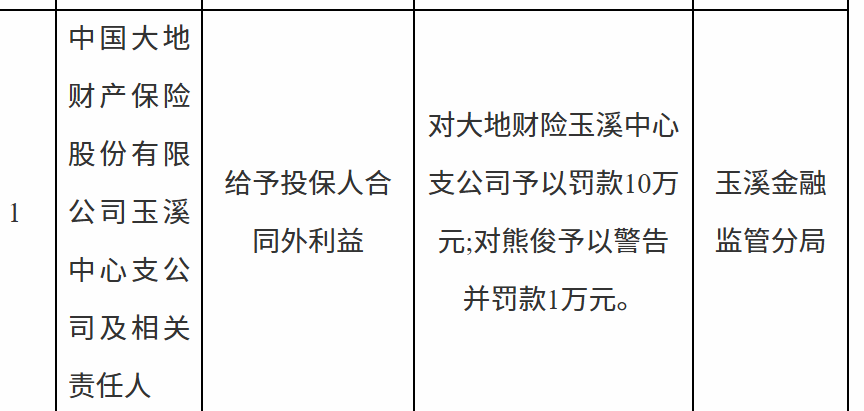 12月30日,中国大地财产保险股份有限公司玉溪中心支公司及相关责任人因给予投保人合同外利益被罚款10万元;熊俊予被警告并罚款1万元。