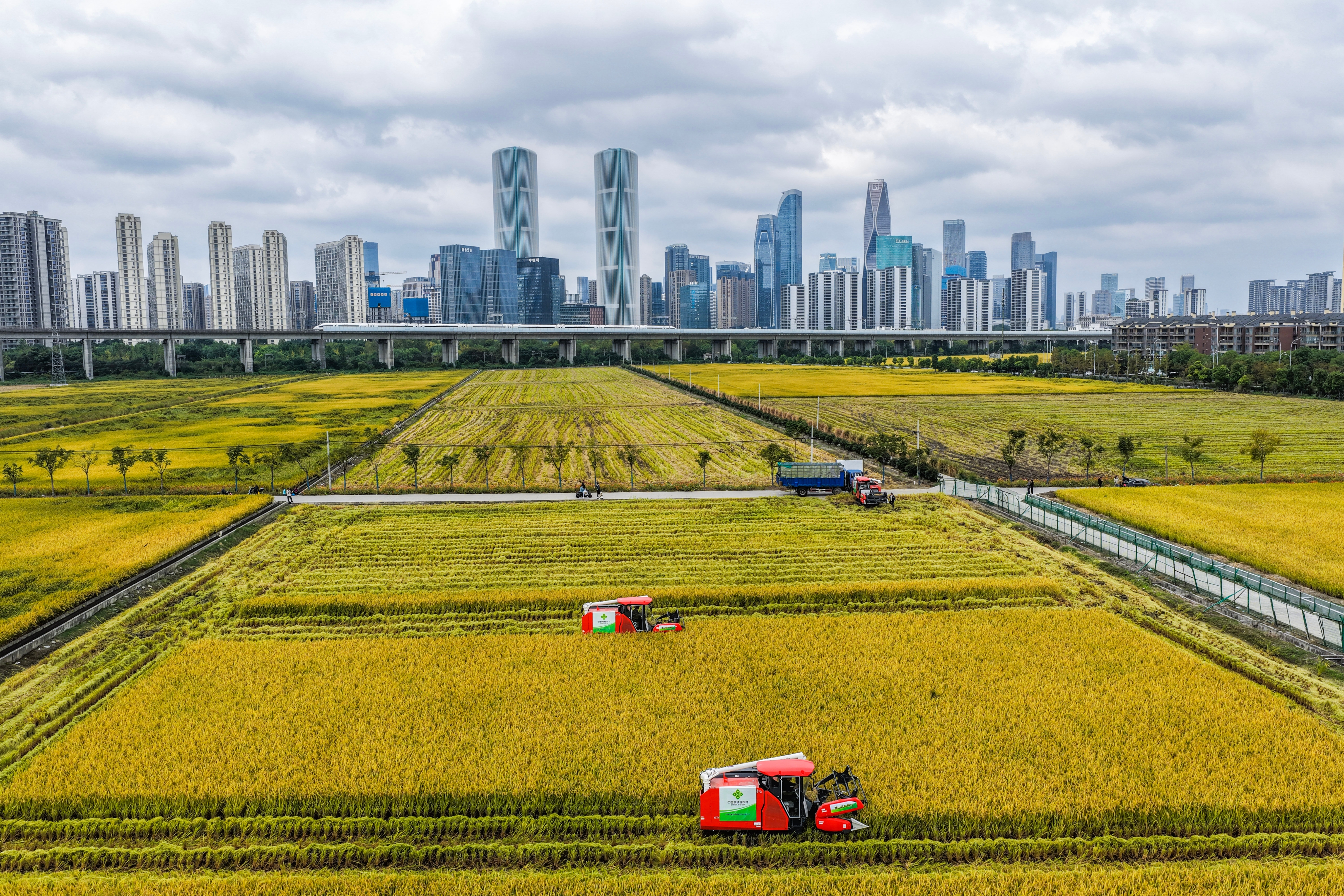 2025年10月21日,在浙江杭州萧山区,收割机在稻田里收割水稻,远处高铁列车飞驰而过(无人机照片)。新华社记者徐昱摄