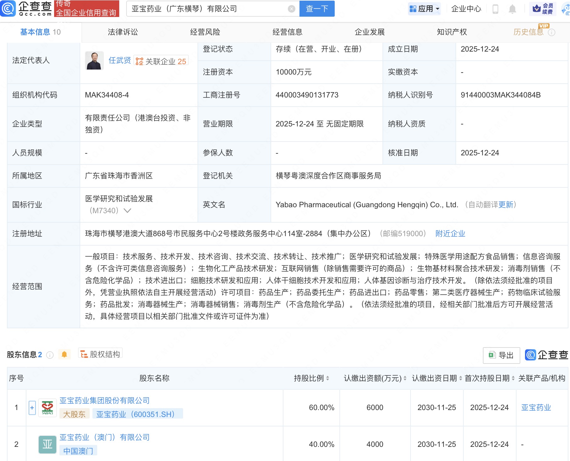 近日,亚宝药业(广东横琴)有限公司成立,法定代表人为任武贤,注册资本1亿人民币,经营范围包括医学研究和试验发展、生物化工产品技术研发、生物基材料聚合技术研发等。企查查股权穿透显示,该公司由亚宝药业(600351)、亚宝药业(澳门)有限公司共同持股。