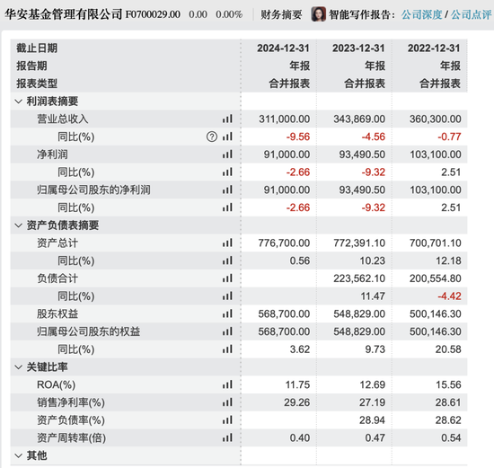 一方面,华安基金近年来在规模扩张方面成绩显著。2024年底公司管理资产规模达7724亿元,公募管理规模达6931亿元,双双实现两位数增长。但另一方面,其业绩指标却连续三年下滑:2024年营收31.1亿元,同比减少3.29亿元;净利润9.1亿元,同比下降0.4亿元。