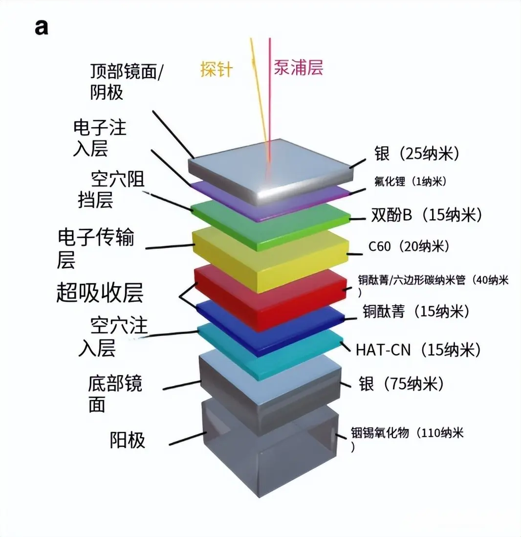 上下两面是银材质的镜面,组成了一个能困住光的法布里-珀罗微腔,它能把入射的光牢牢束缚在腔体里,中间的核心层是酞菁铜吸能分子,光被关在微腔里反复反射就会和其中无数的酞菁铜分子产生强耦合,激发出分子间的集体量子效应,从而实现理论预言中分子越多、充电越快的超广延超快充电。