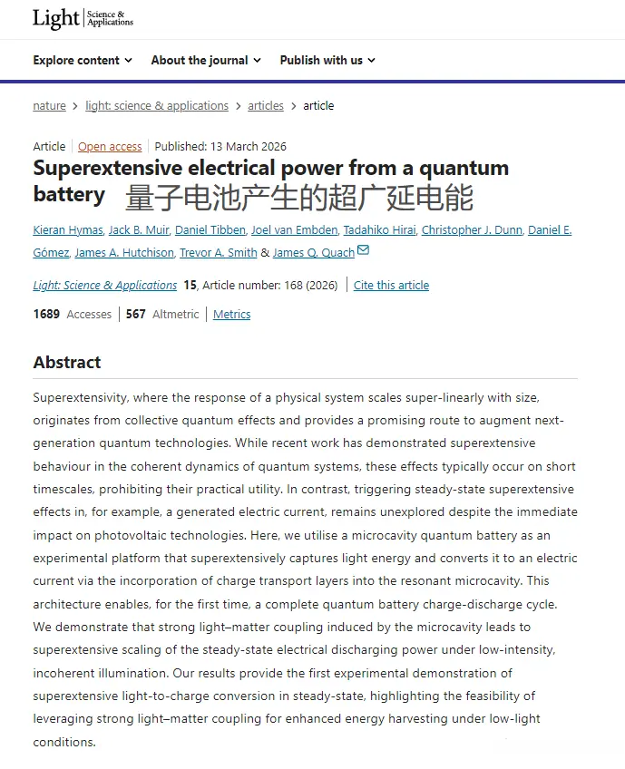 它靠的是量子世界里一种特别反常识的集体量子效应,也就是论文里提到的超广延性:电池里负责吸能储能的分子越多,不仅充电速度越快,就连对外输出电能的功率也会实现超线性的增长。